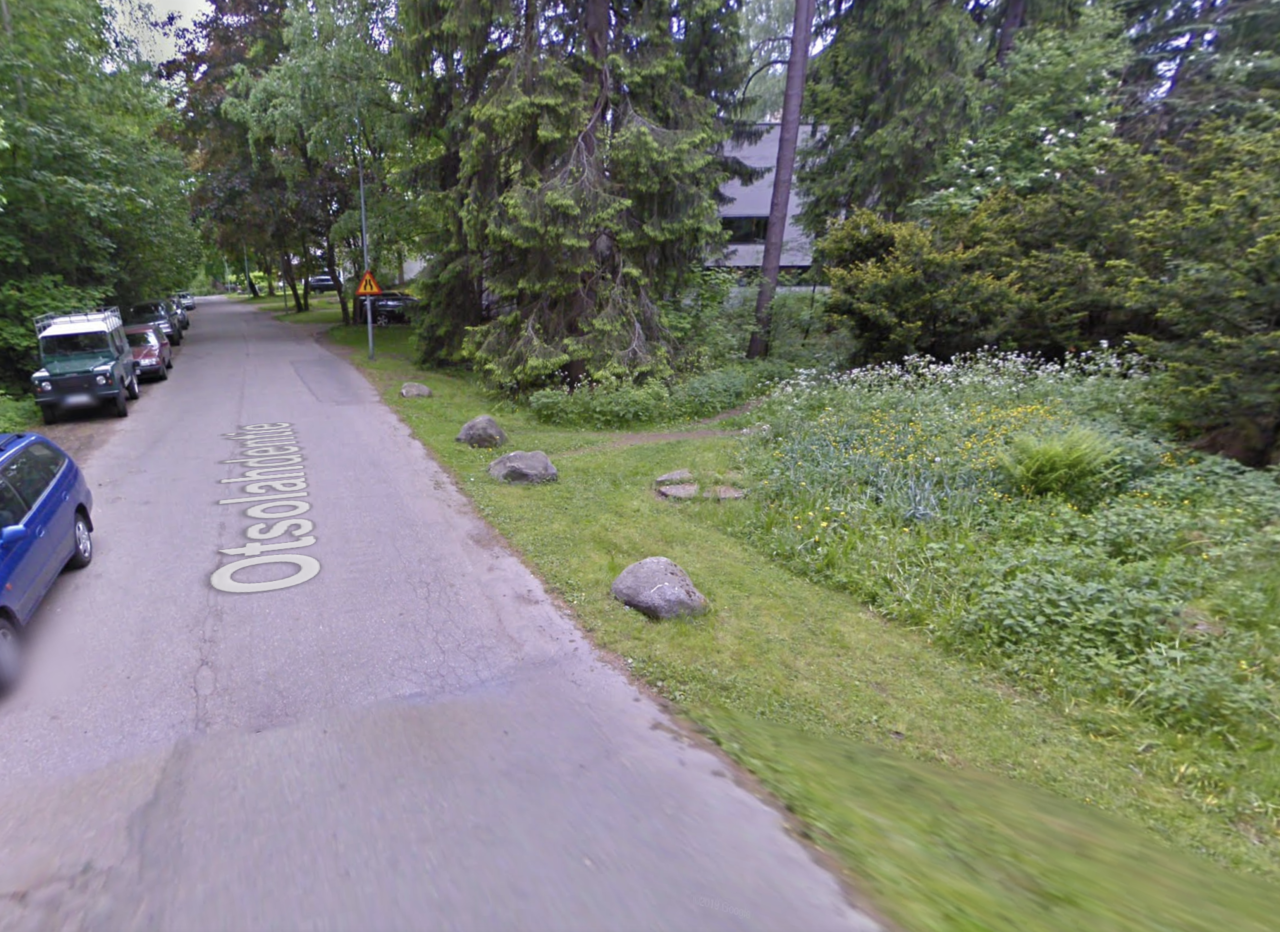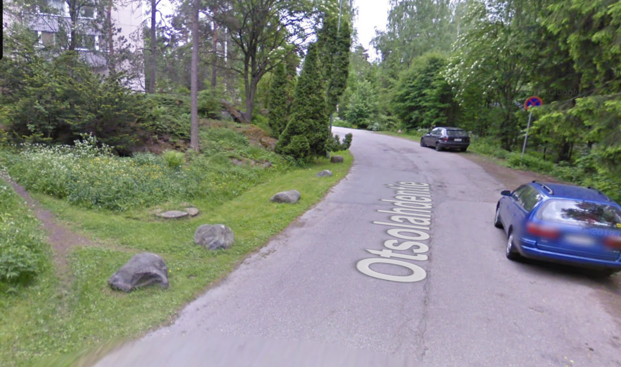 Löytyneen myllynkiven sijainti Otsolahdentien numeroiden 10 ja 14 välisellä kaupungin alueella (kuva: Google Street View 2009), yllä ja alla.