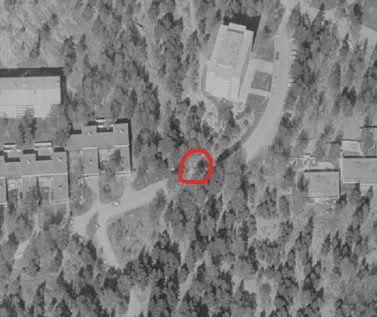 Vasemmalla Espoon karttapalvelun ilmakuva vuodelta 1969. Löytynyt myllynkivi erottuu juuri ja juuri paikasta, josta se löydettiin. Milloin, miksi ja kenen toimesta myllynkivi (tai sen palaset) tänne siirretiin, kas siinäpä kysymys?