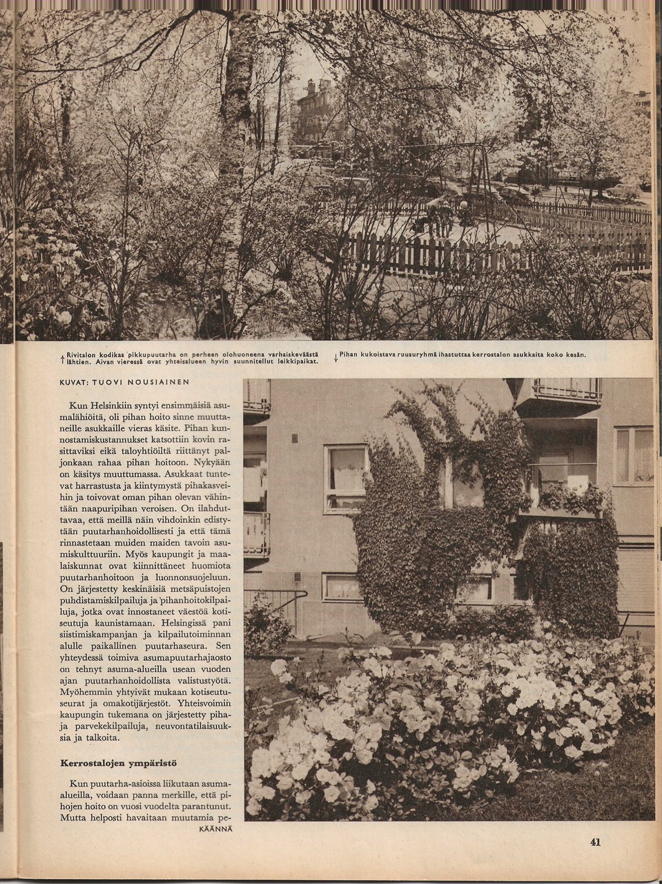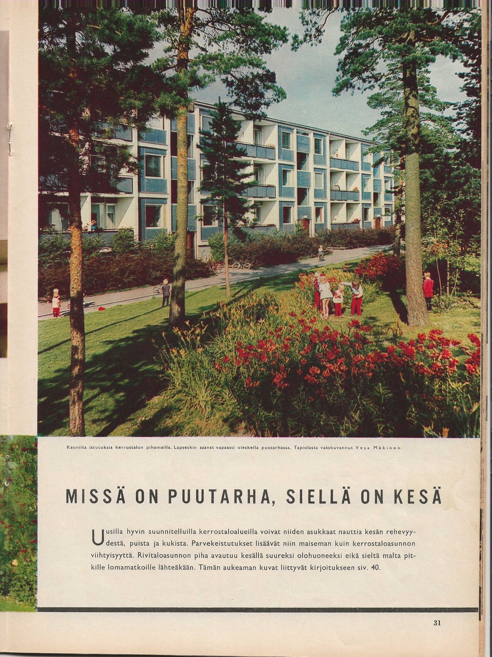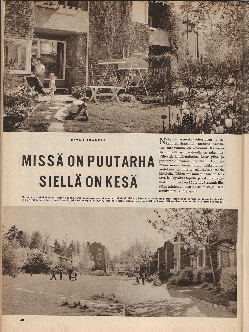 Artikkeli yleisesti puutarhoista lähiöissä. Mukana mainoskuva, jossa taustalla Tapiolan yhteiskoulu.