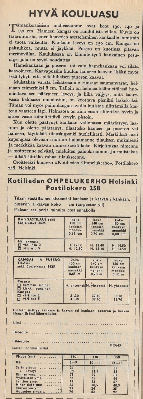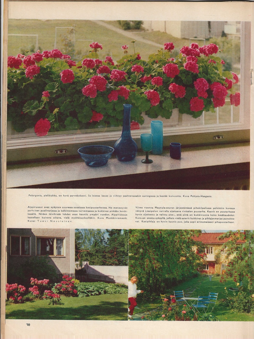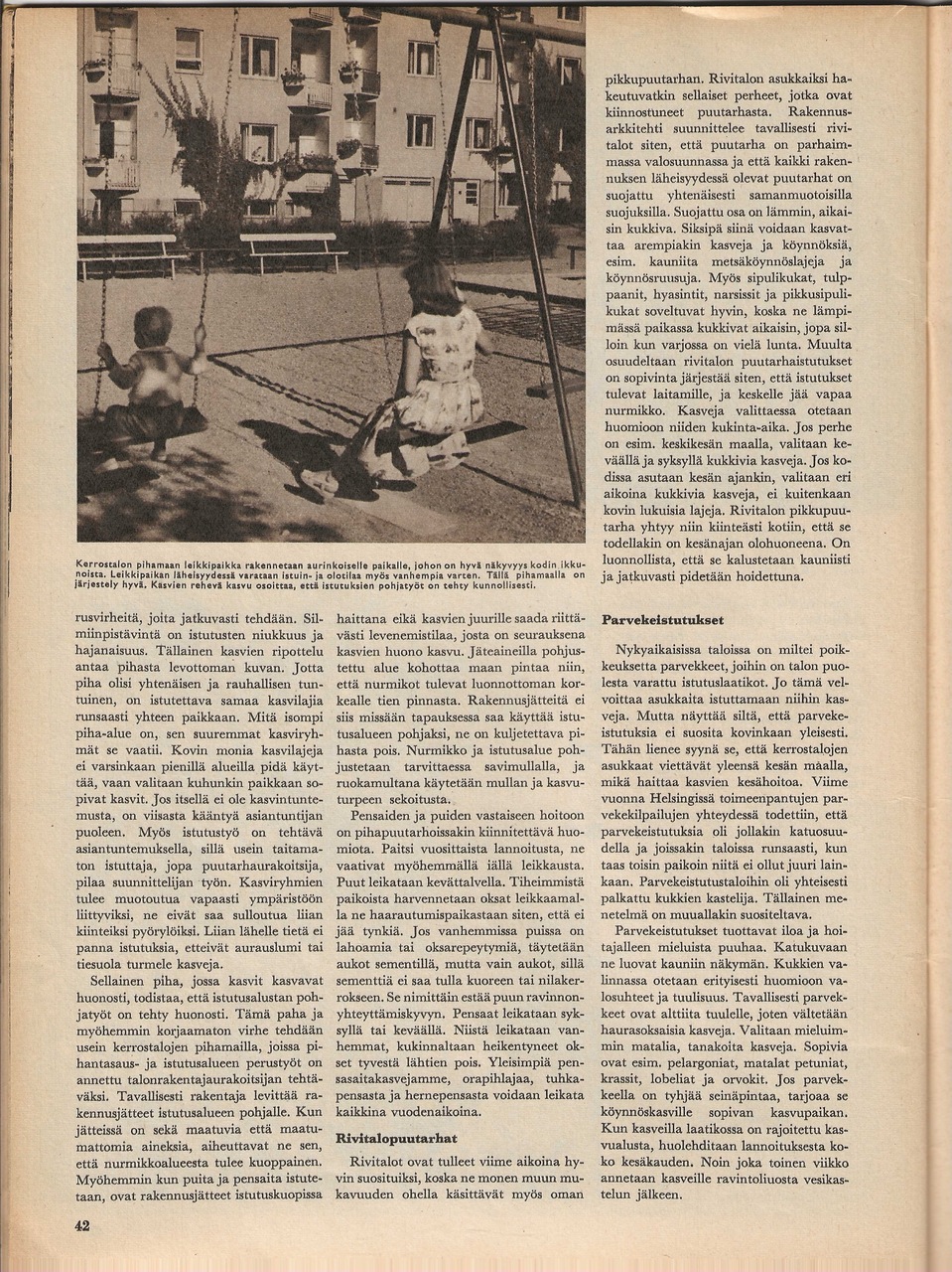 Artikkeli yleisesti puutarhoista lähiöissä. Mukana mainoskuva, jossa taustalla Tapiolan yhteiskoulu.