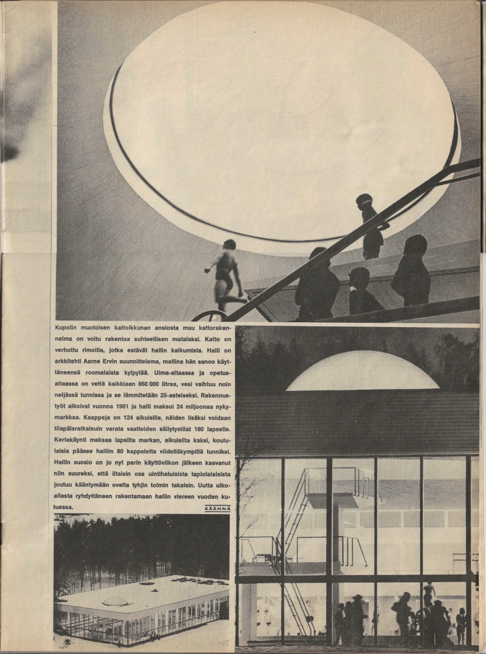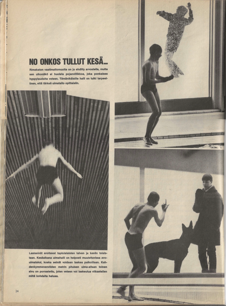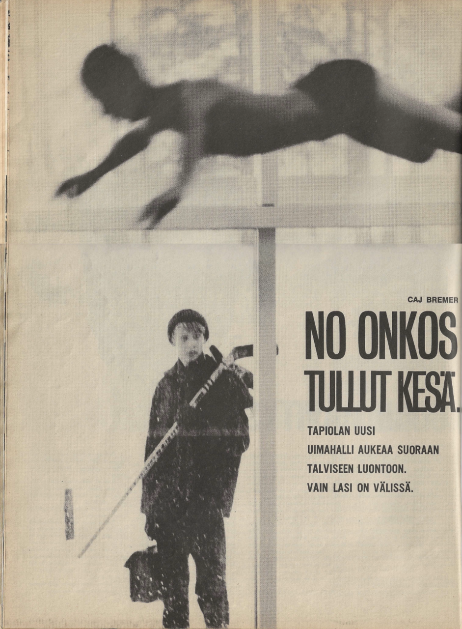 "No onkos tullut kesä" - Tapiolan uusi uimahalli aukeaa suoraan talviseen luontoon. Vain lasi on välissä, kertoo Viikkosanomat vuoden 1965 joulukuun numerossaan 50.