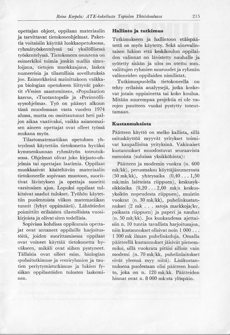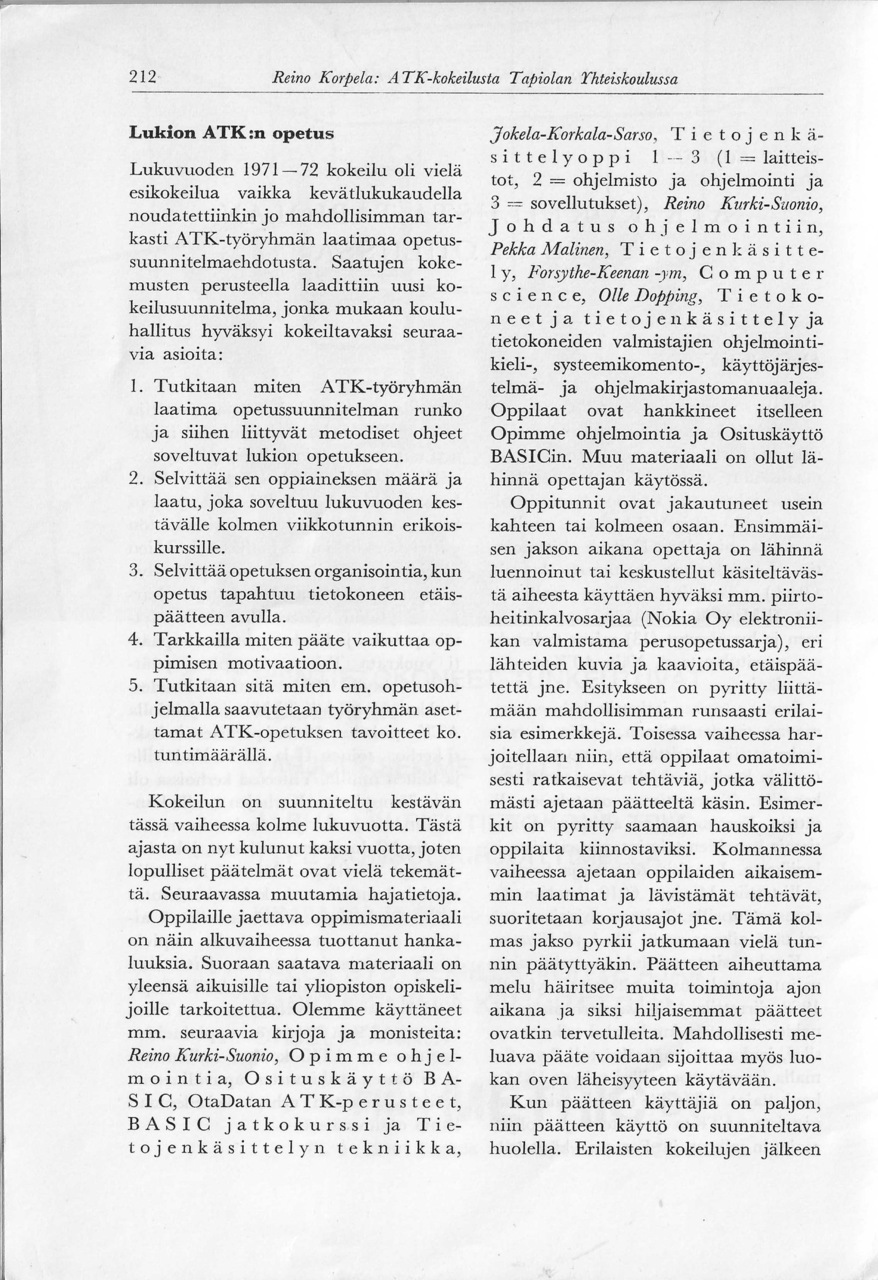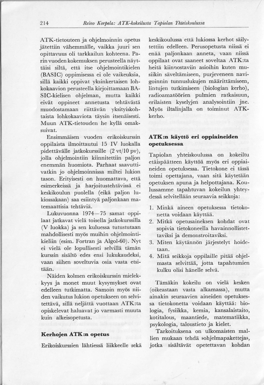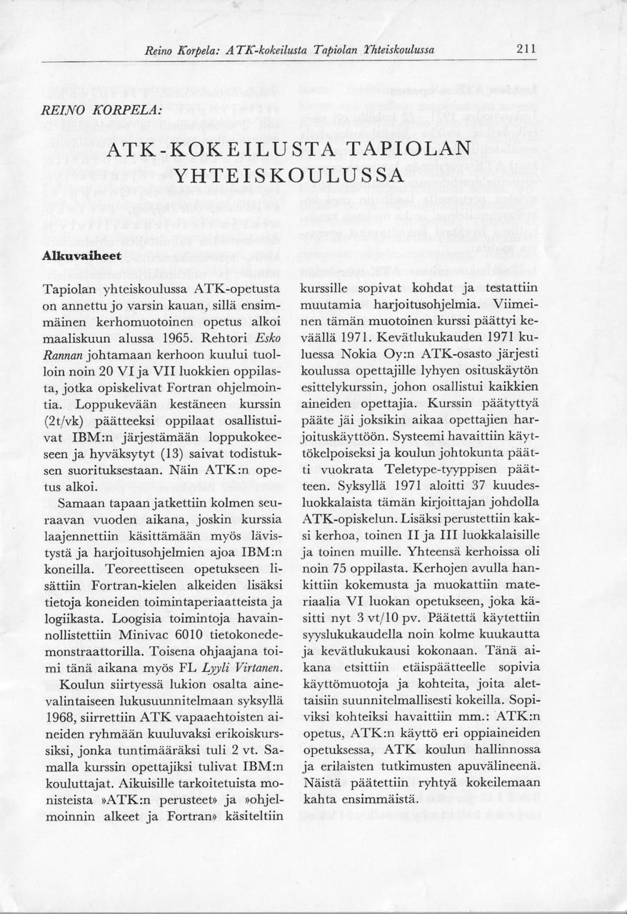Matemaattisten aineiden opettajien liiton julkaisemassa "Matemattisten aineiden aikakauskirjan" numerossa 4 vuodelta 1974 julkaistiin Tapiolan yhteiskoulun lehtori Reino Korpelan kirjoitus "ATK-kokeilusta Tapiolan yhteiskoulussa".