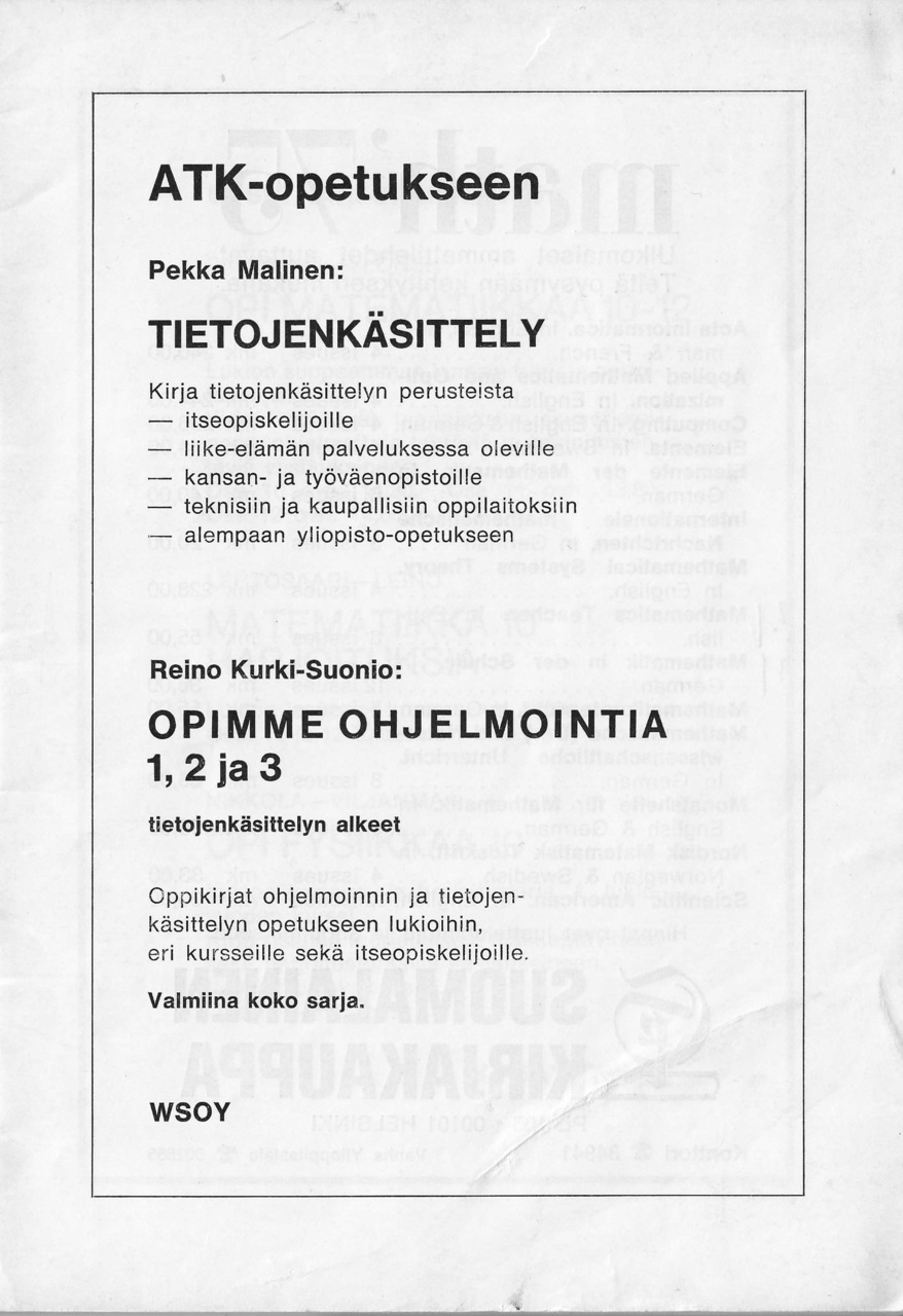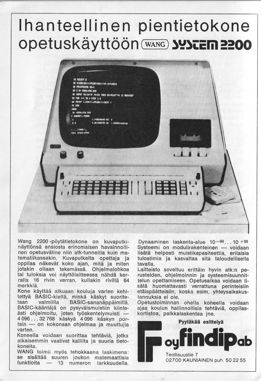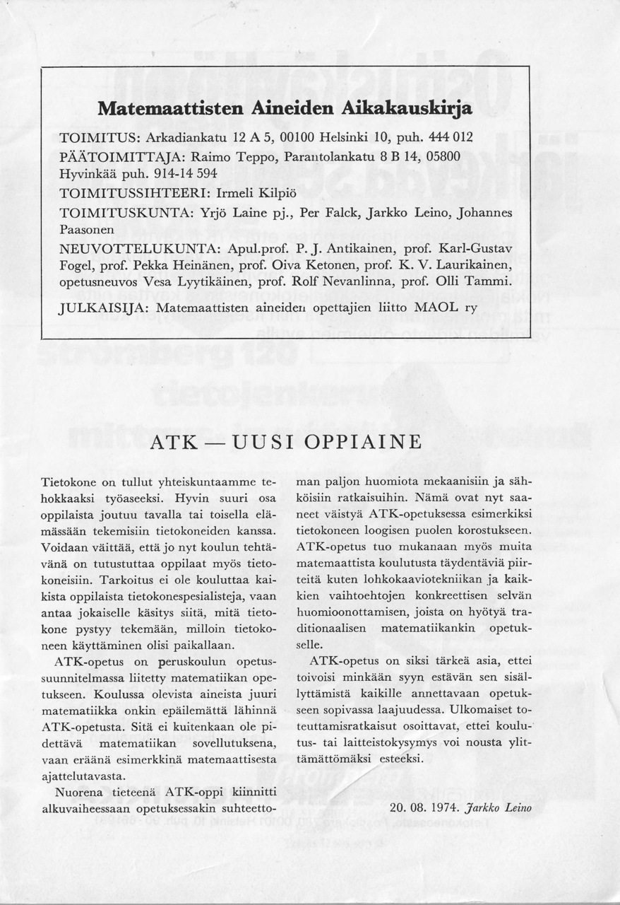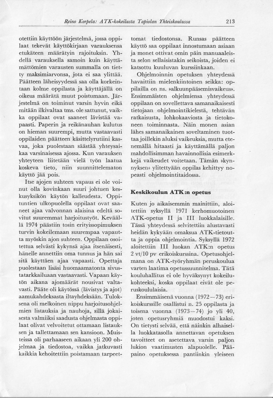 Matemaattisten aineiden opettajien liiton julkaisemassa "Matemattisten aineiden aikakauskirjan" numerossa 4 vuodelta 1974 julkaistiin Tapiolan yhteiskoulun lehtori Reino Korpelan kirjoitus "ATK-kokeilusta Tapiolan yhteiskoulussa".