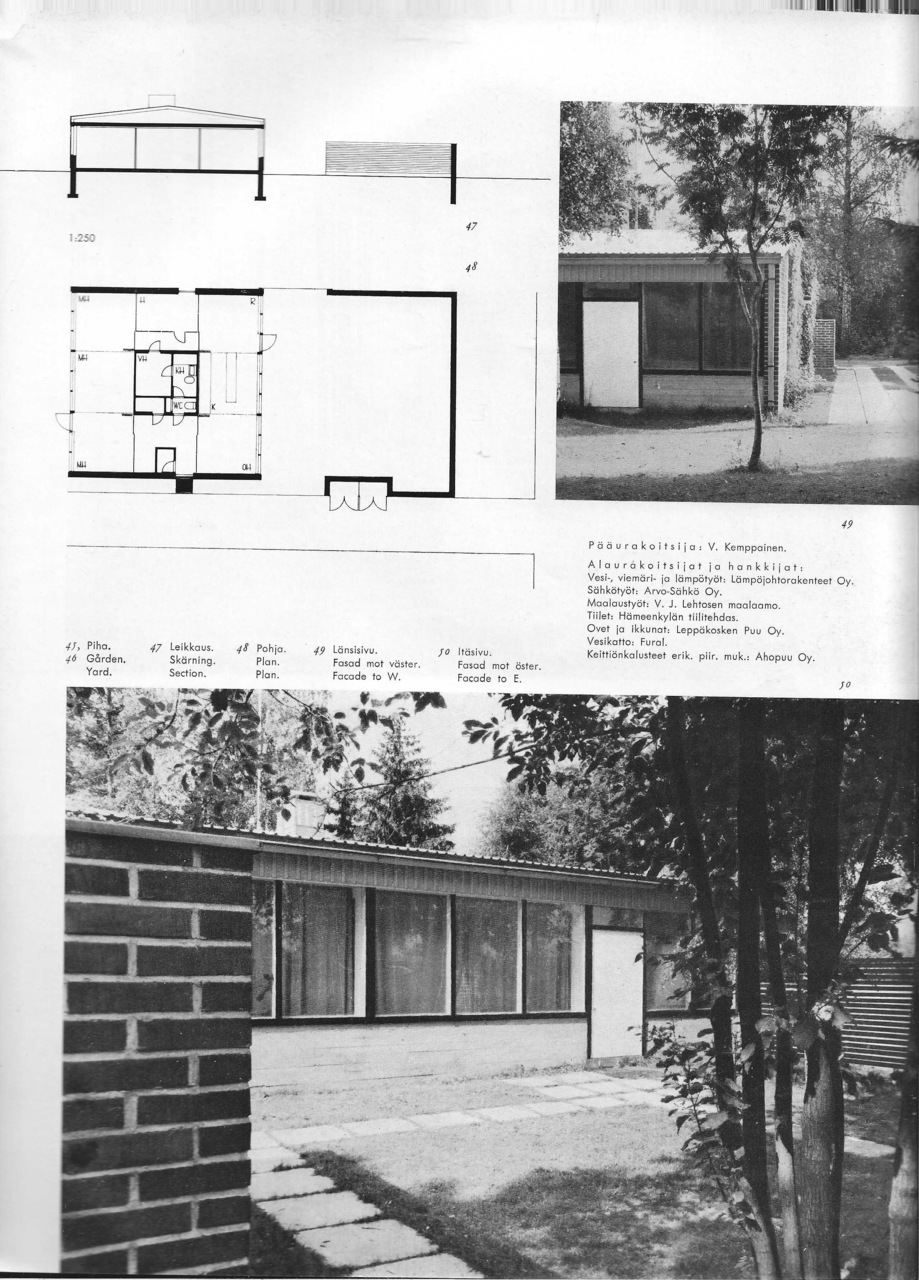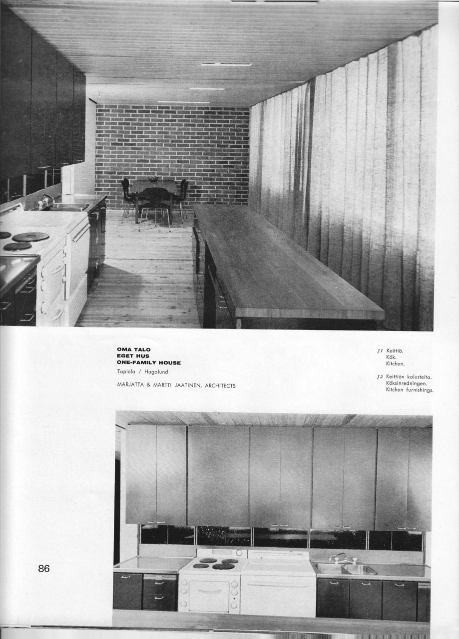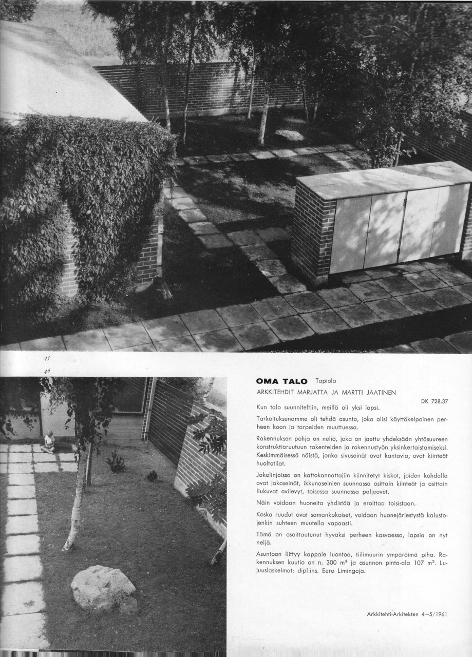 Arkkitehti-lehden artikkelissa vuodelta 1961 esiteltiin arkkitehtien Marjatta ja Martti Jaatinen omakotitalo Tapiolassa.